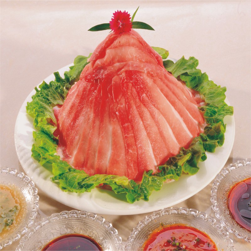 B.中火煮礦泉水(山泉水為最佳,不能使用自來水,因自來水中含氯制劑高影響口感),加以姜汁酒,小蔥段,煮開,下肉片,灼至肉片卷曲,即可撈出,灼好金針菇,灼好有機(jī)蔬菜圍邊。配以香辣蒜蓉碟,小蔥醬油碟、白切姜蔥碟,供蘸食
